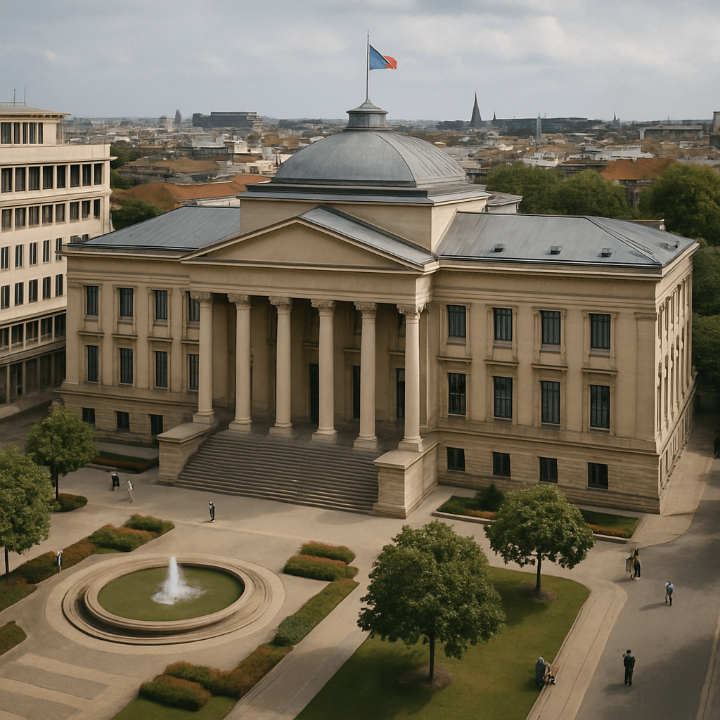 “Neoclassical government building representing institutional strength.”