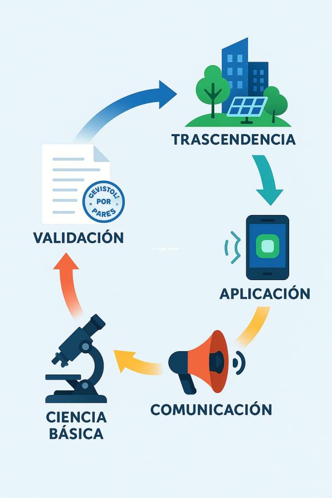 - Validación y Comunicación Interna (Ciencia): El descubrimiento es revisado por pares y publicado en literatura especializada, entrando al acervo del conocimiento humano. Esta fase es el control de calidad que asegura el rigor.